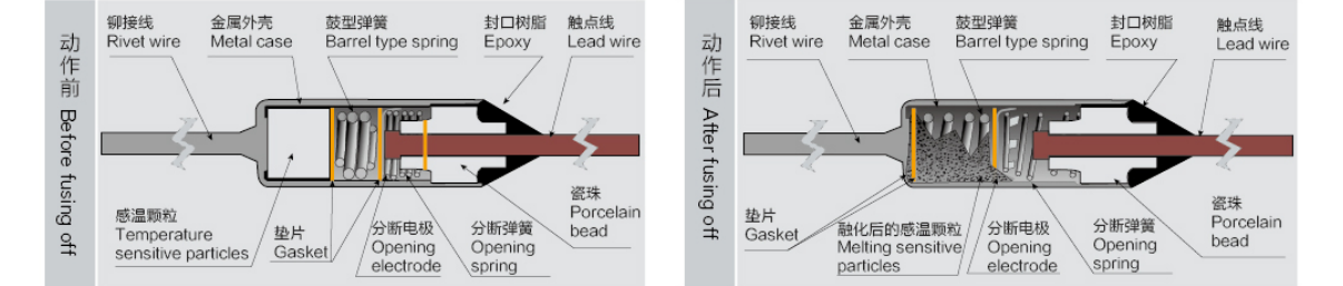 Gdy temperatura otoczenia przekroczy temperaturę roboczą, wrażliwe cząstki stopią się pod wpływem ciepła z przewodu prowadzącego. W tym stanie sprężyna otwierająca zostanie rozciągnięta, a siła sprężystości dociśnie elektrodę do sprężyny, przecinając połączenie z przewodem prowadzącym. Prąd również zostanie odcięty.